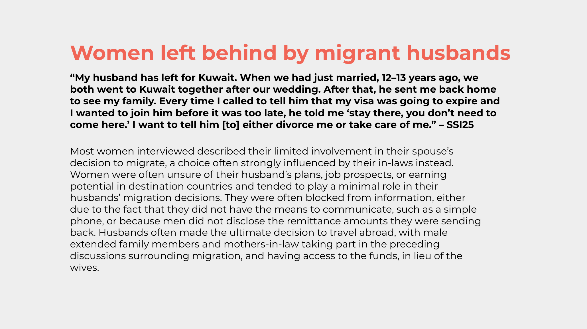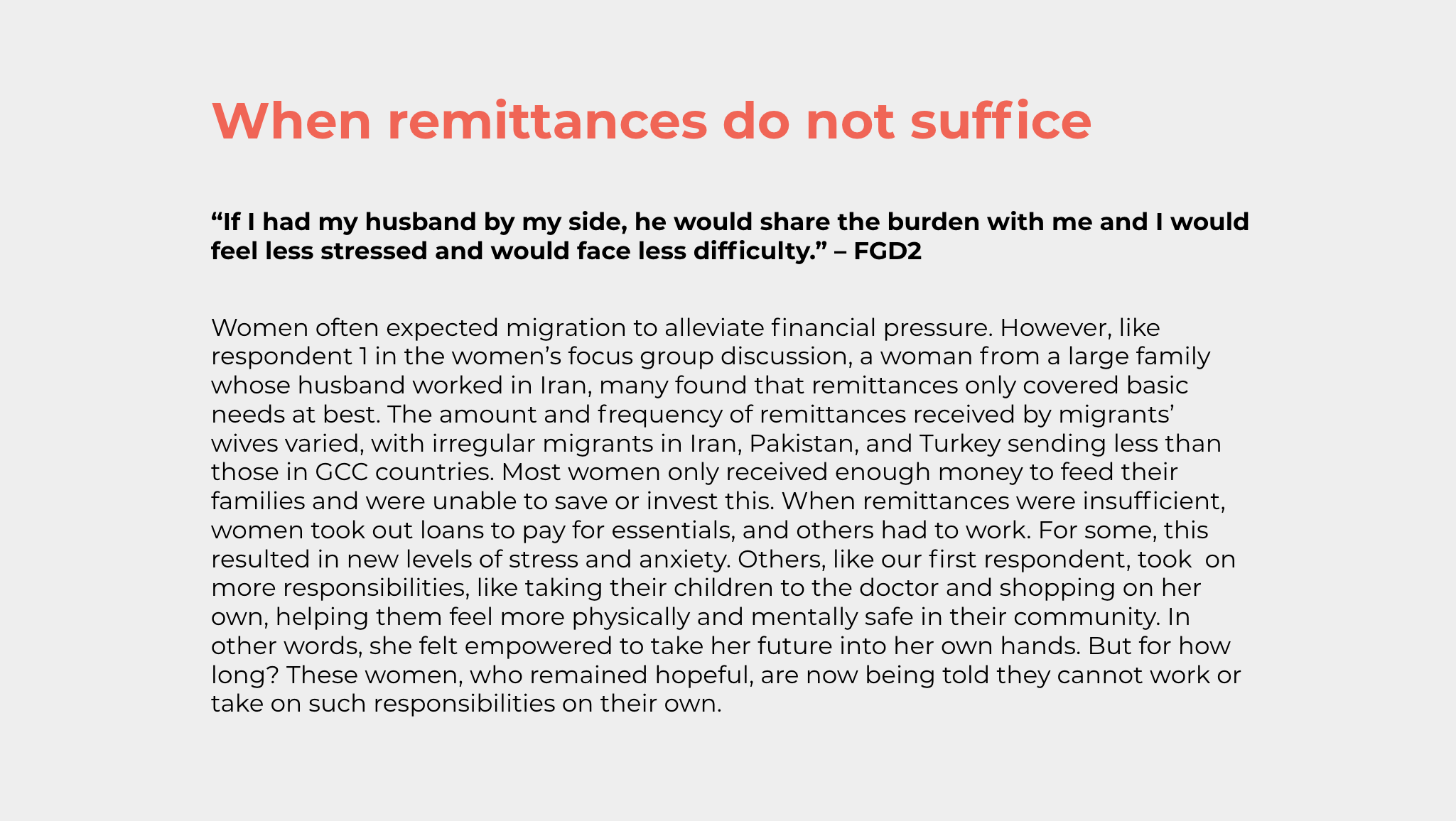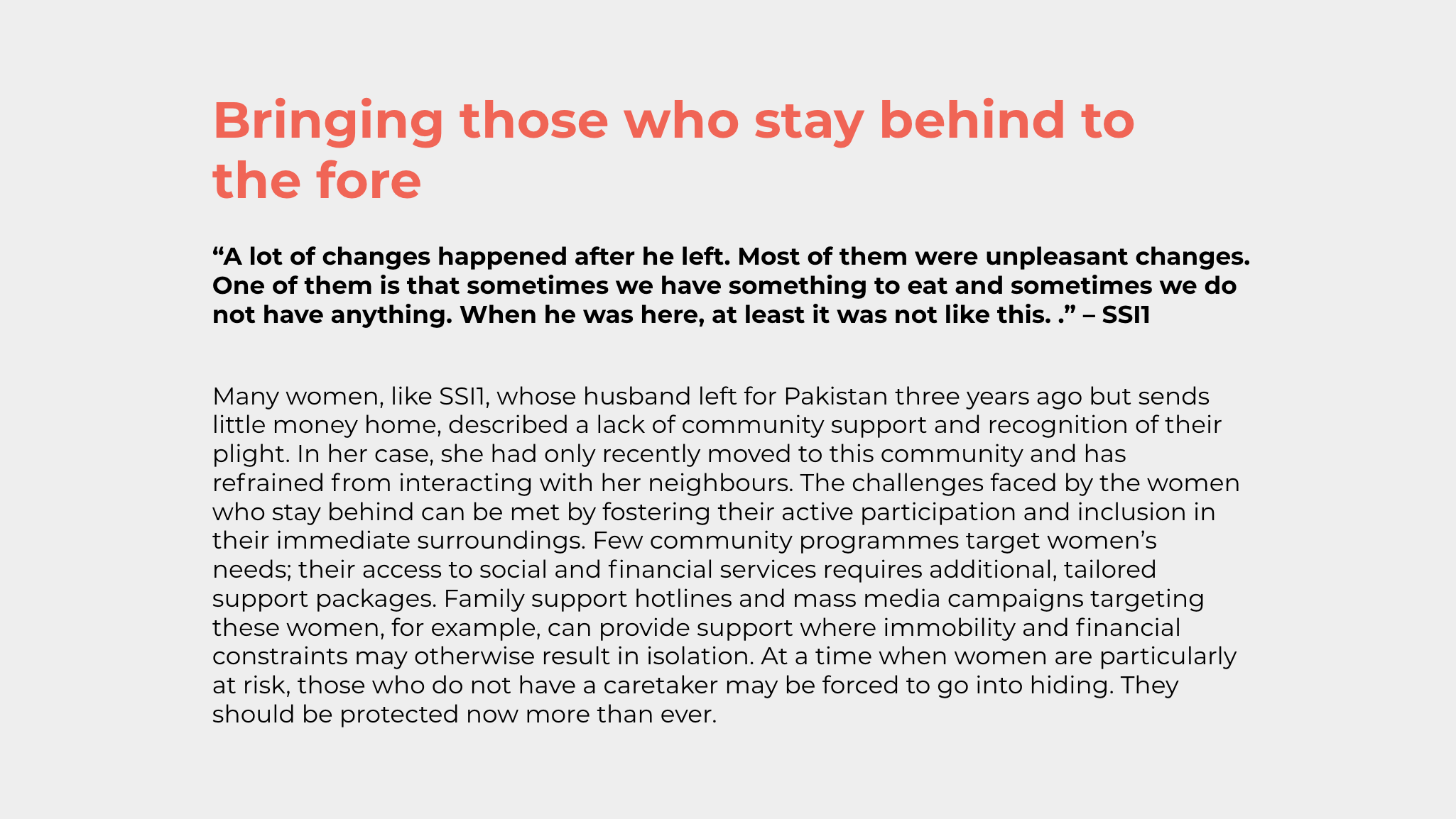 The impact of labour migration on the spouses and children of Afghan migrants, who often stay behind in Afghanistan, remains overlooked. Amidst an uncertain future for women’s rights in Afghanistan, women have to take on an unbearable burden and levels of uncertainty affecting their lives and those of their children. Women and children are likely to bear the brunt of political unrest and an economy near collapse. Those who are heading their own households or waiting for their husband’s remittances are either unable to work or unable to access remittances which are a lifeline for them. Women and children already make up 80% of internally displaced persons (IDPs), one of the most vulnerable subgroups of the Afghan population. Under a Taliban-led government, amplifying the voices of the millions of women and children left behind, who were already marginalised before the Taliban’s 2021 offensive, has become even more crucial. As we follow the announcements made by the new government, we reflect on the needs of a specific group of women and children in Afghanistan through our latest fieldwork.